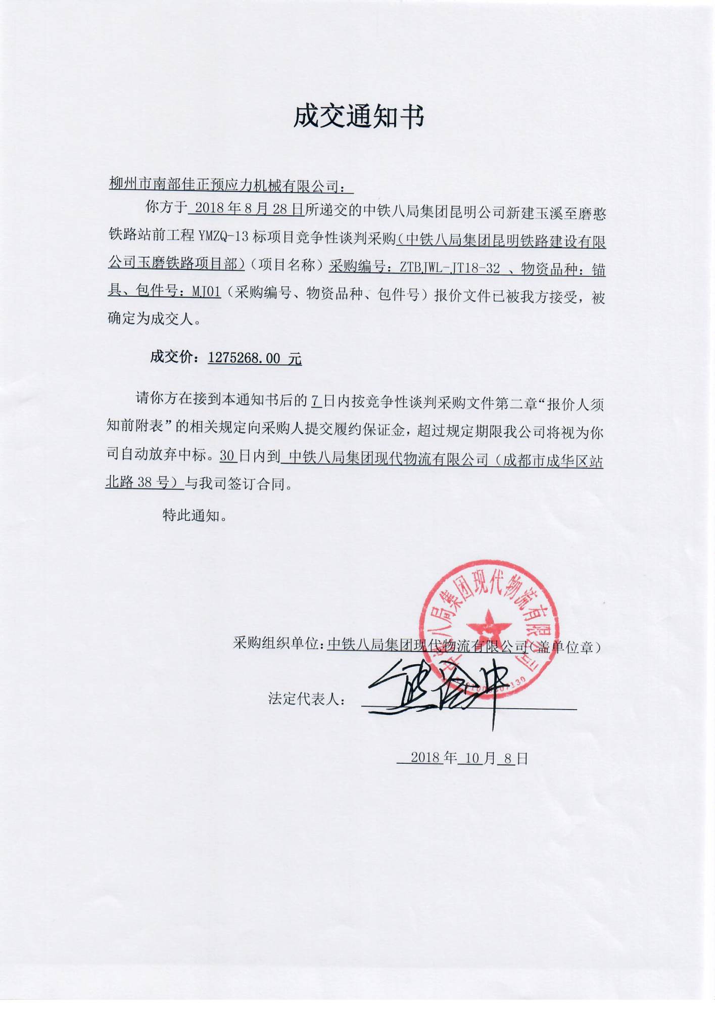 中鐵八局玉磨鐵路錨具中標(biāo)通知書